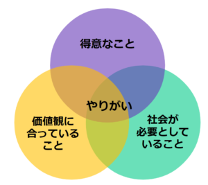 やりがいについてお話ししたいと思います。最近やりがいについていろいろなところで聞く機会があり、考えることが多かったです。やりがいとは、私の中での定義なのですが、自分の強みが生かせて、かつ自分の価値観と合っており、社会が必要としているというこの3つが重なり合ったものの真ん中の部分だと思います。